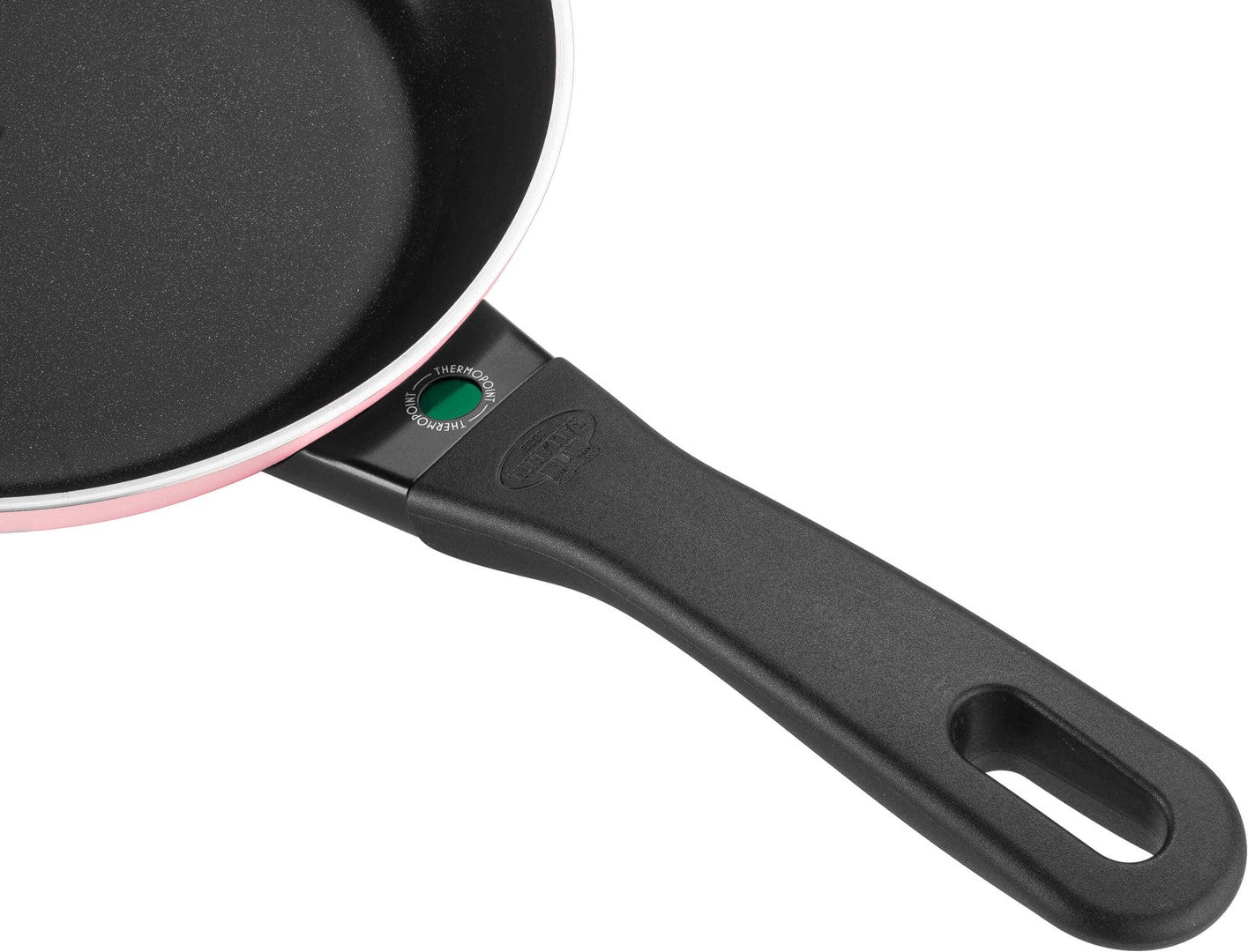 - Nowoczesna konstrukcja patelni w różowym kolorze