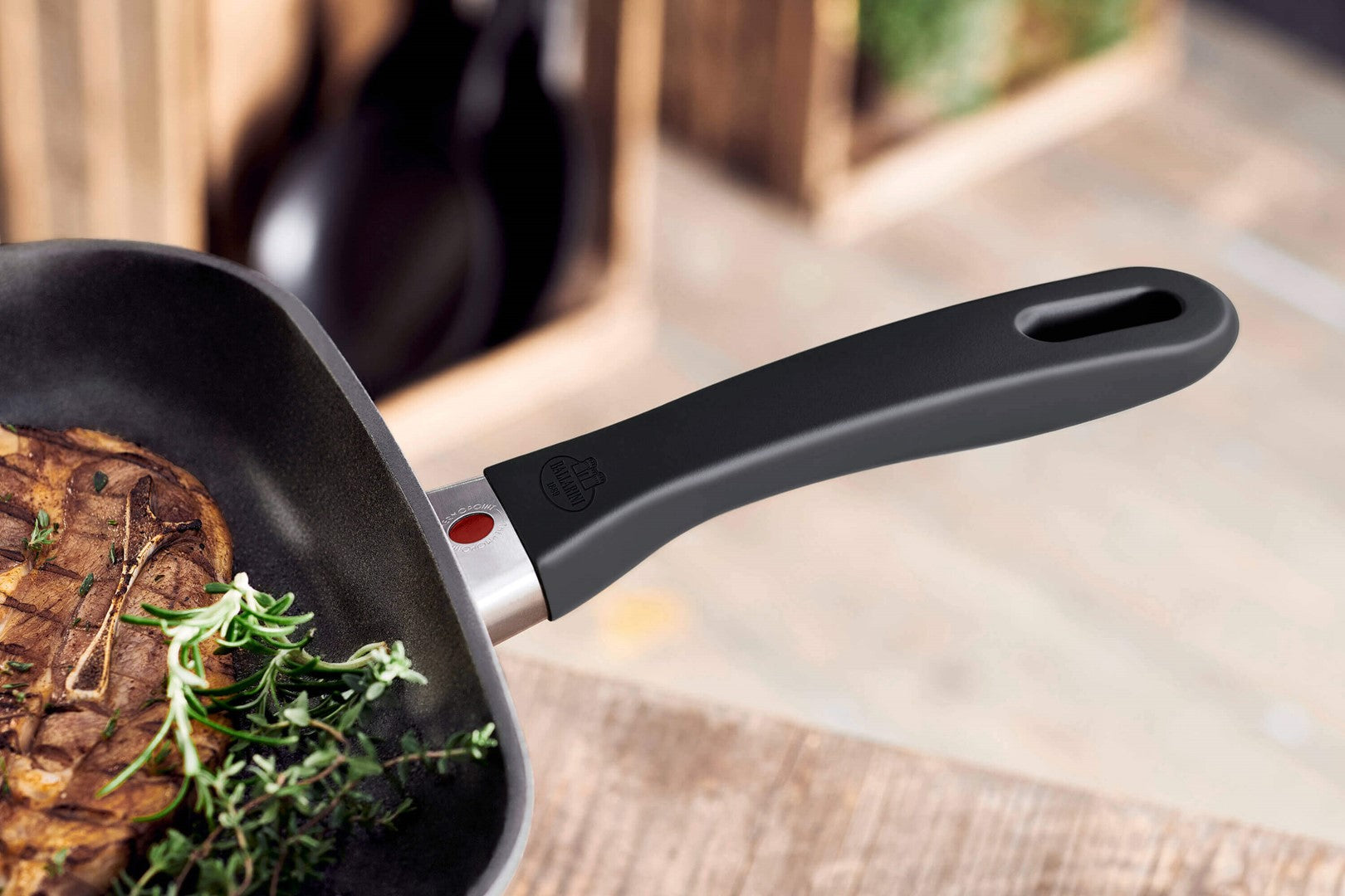 Dzięki masywnemu aluminium, z którego wykuta została patelnia, ciepło rozprowadzane jest szybko i równomiernie na jej całej powierzchni. Używana może być na wszystkich rodzajach kuchenek, a wykorzystanie płyty indukcyjnej dodatkowo wpłynie na zaoszczędzenie energii. Umożliwia to specjalnie opracowana technologia Radiant Induction. Kolejną zaletą patelni jest możliwość mycia w zmywarce, czego z całą pewnością nie można zrobić w przypadku klasycznego grilla. Po co więc tracić cenny czas na szorowanie i skrobanie kratki grillowej, skoro można go poświęcić na cieszenie się soczystym stekiem w gronie najbliższych?
