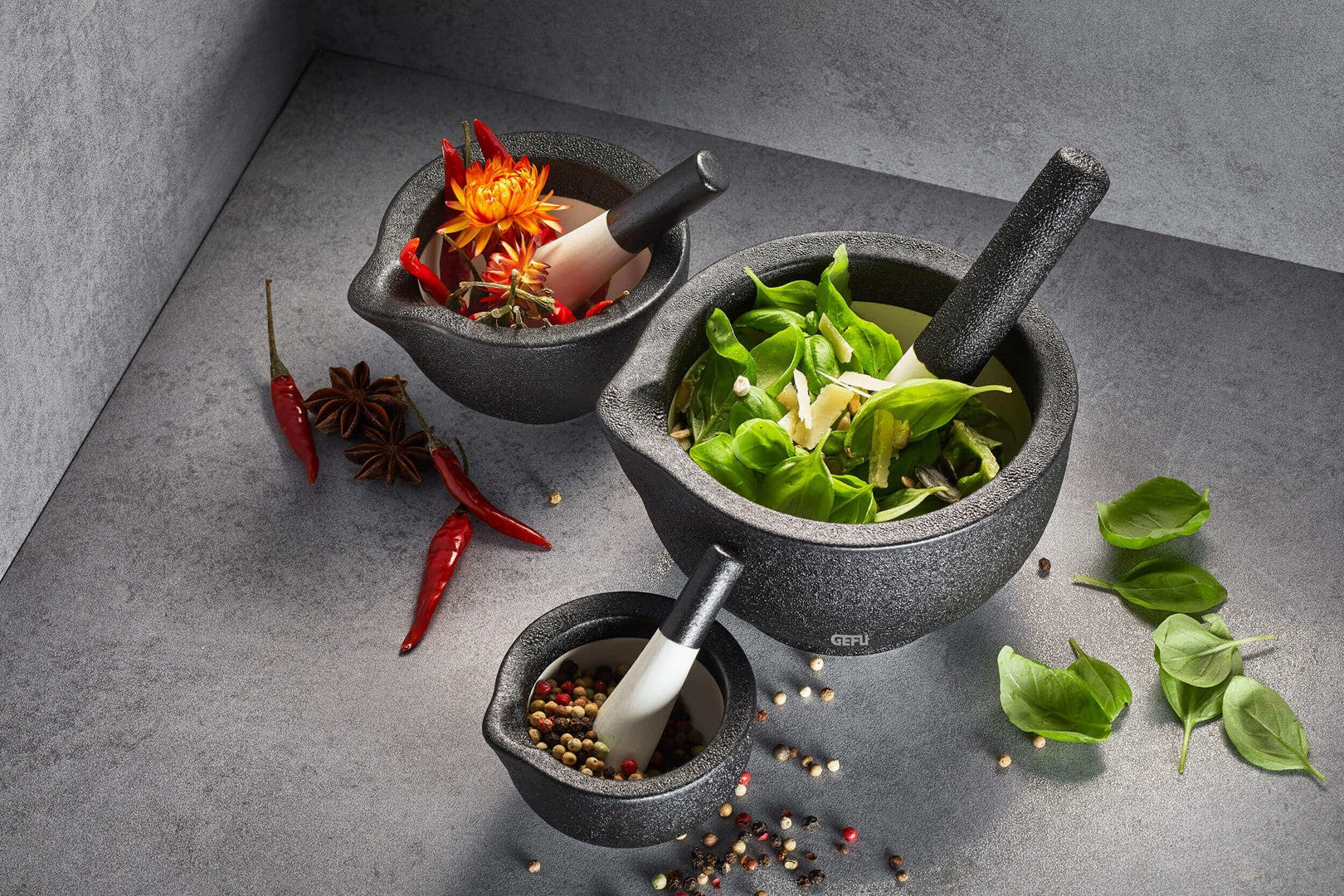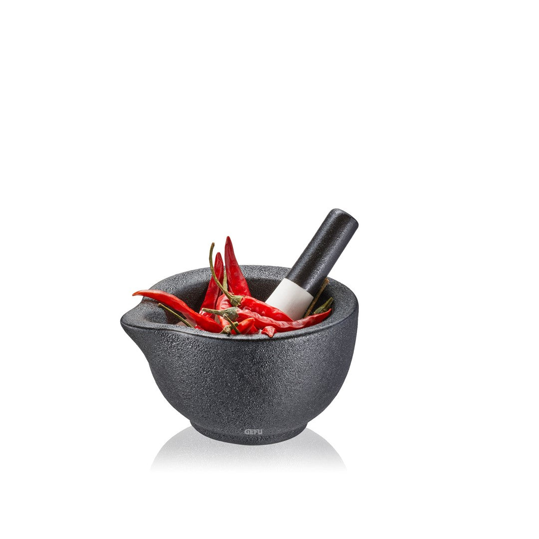 Moździerz GRINO to idealny towarzysz dla miłośników intensywnych aromatów. Dzięki szorstkiej powierzchni ręcznie wykonanego moździerza, uzyskasz doskonałe rezultaty ucierania. Ergonomicznie ukształtowany tłok bez trudu rozdrobni ziarna pieprzu, twarde kryształki soli i różne egzotyczne przyprawy. W tym moździerzu z łatwością zamienisz bazylie w pyszne pesto, a każde jego użycie będzie prawdziwą przyjemnością dla zmysłów.