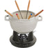 - Zestaw składający się z górnej części do fondue i podgrzewacza wykonanych z żeliwa, palnika, osłony przeciwbryzgowej i 6 widelców do fondue