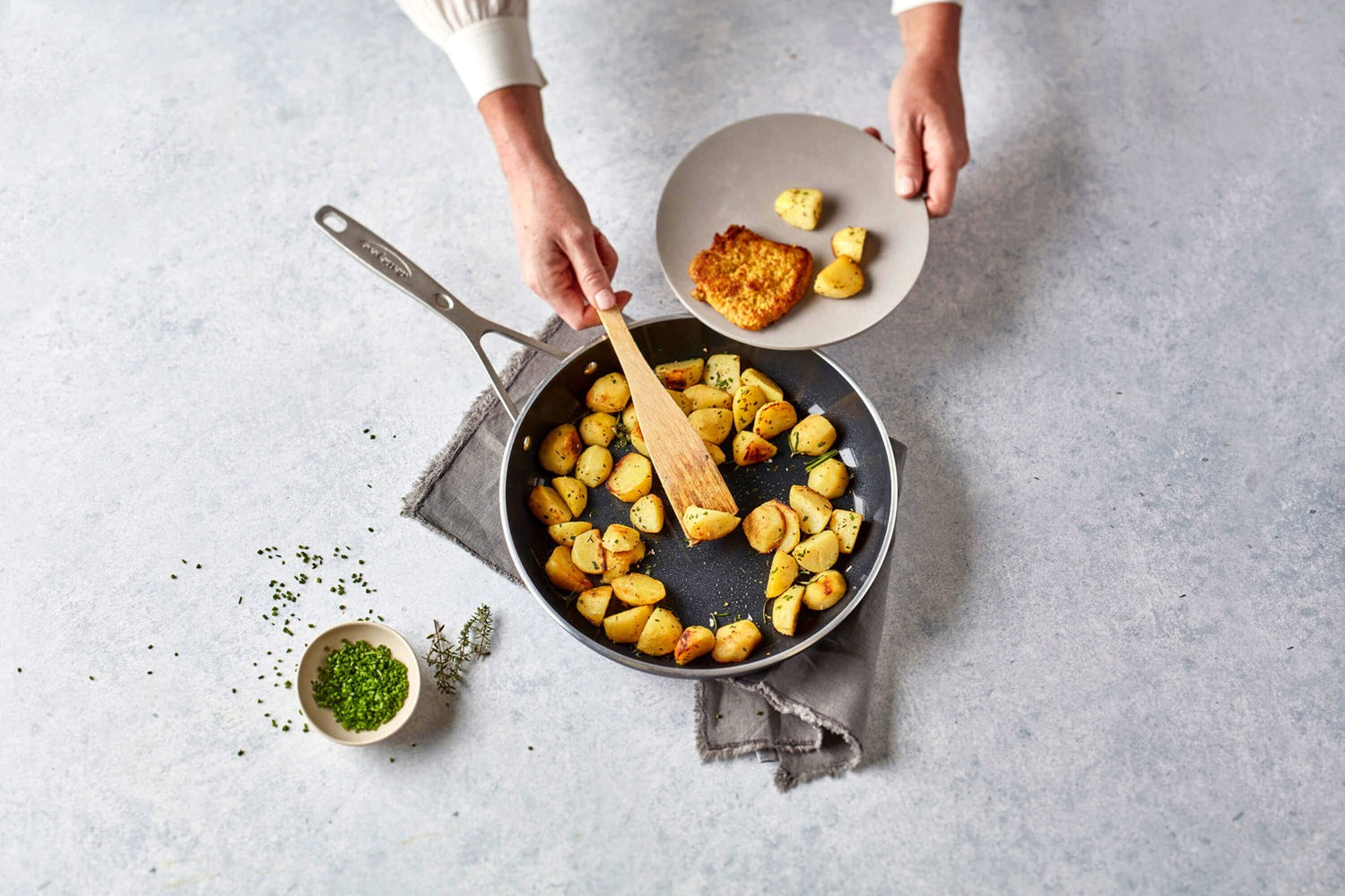 Um Beschädigungen zu vermeiden, sollten Sie ausschließlich Zubehörteile aus Holz oder Silikon verwenden. Der Aluminiummikörper der Alu Industry 3 Pfanne ist besonders dick und sehr langlebig, und das Kochgeschirr lässt sich leicht reinigen und bedienen. Dank des einzigartigen Radiant® Bodens bleibt es über viele Jahre besonders stabil und hat immer optimalen Kontakt zu jeder Kochfläche, einschließlich Induktion. Wichtig ist, dass das Geschirr Wärme schnell und gleichmäßig verteilt und blitzschnell auf Temperaturänderungen reagiert.